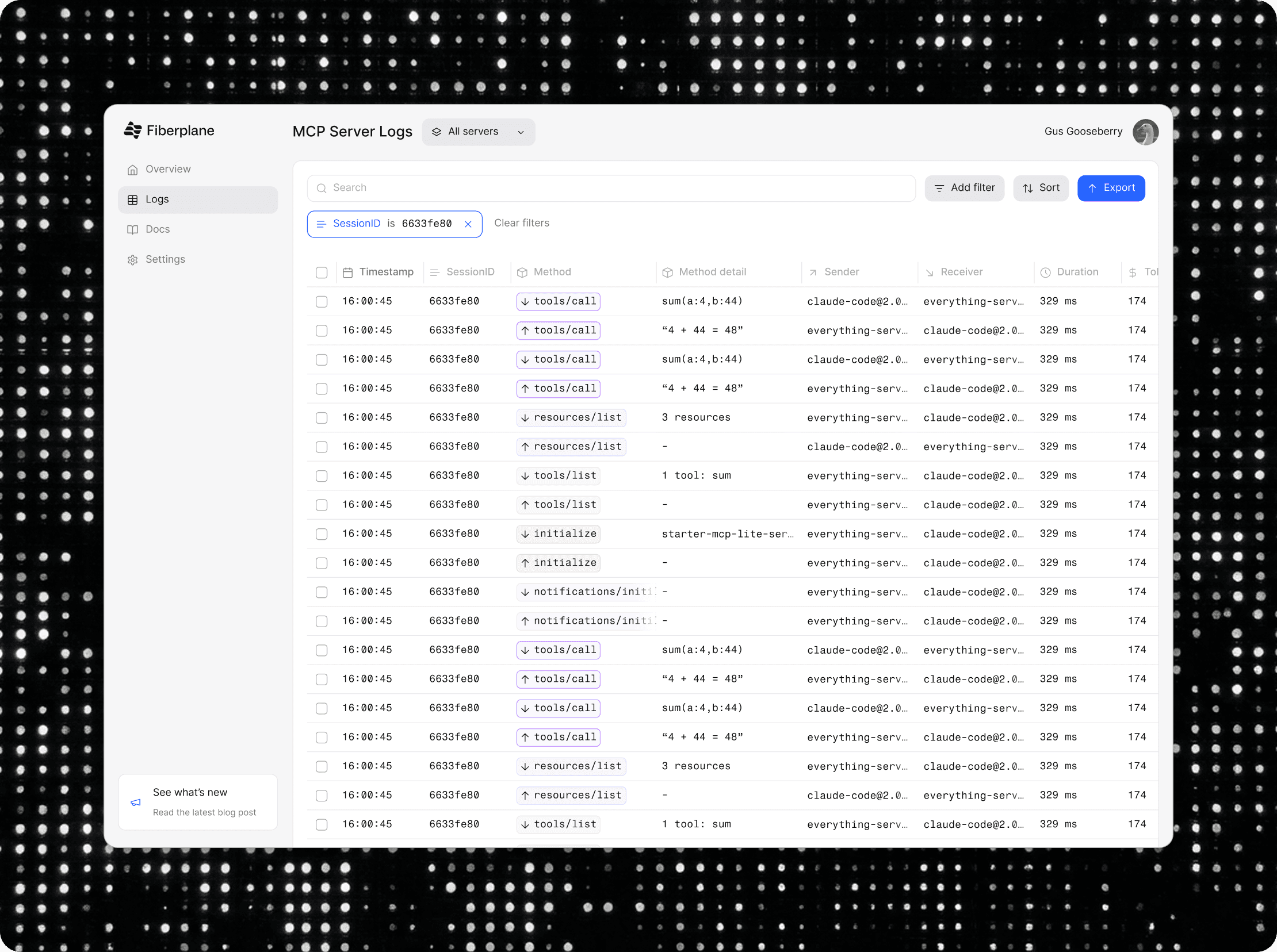 Full observability via the MCP Gateway: logs, traces, token usage, and tool-call analytics.