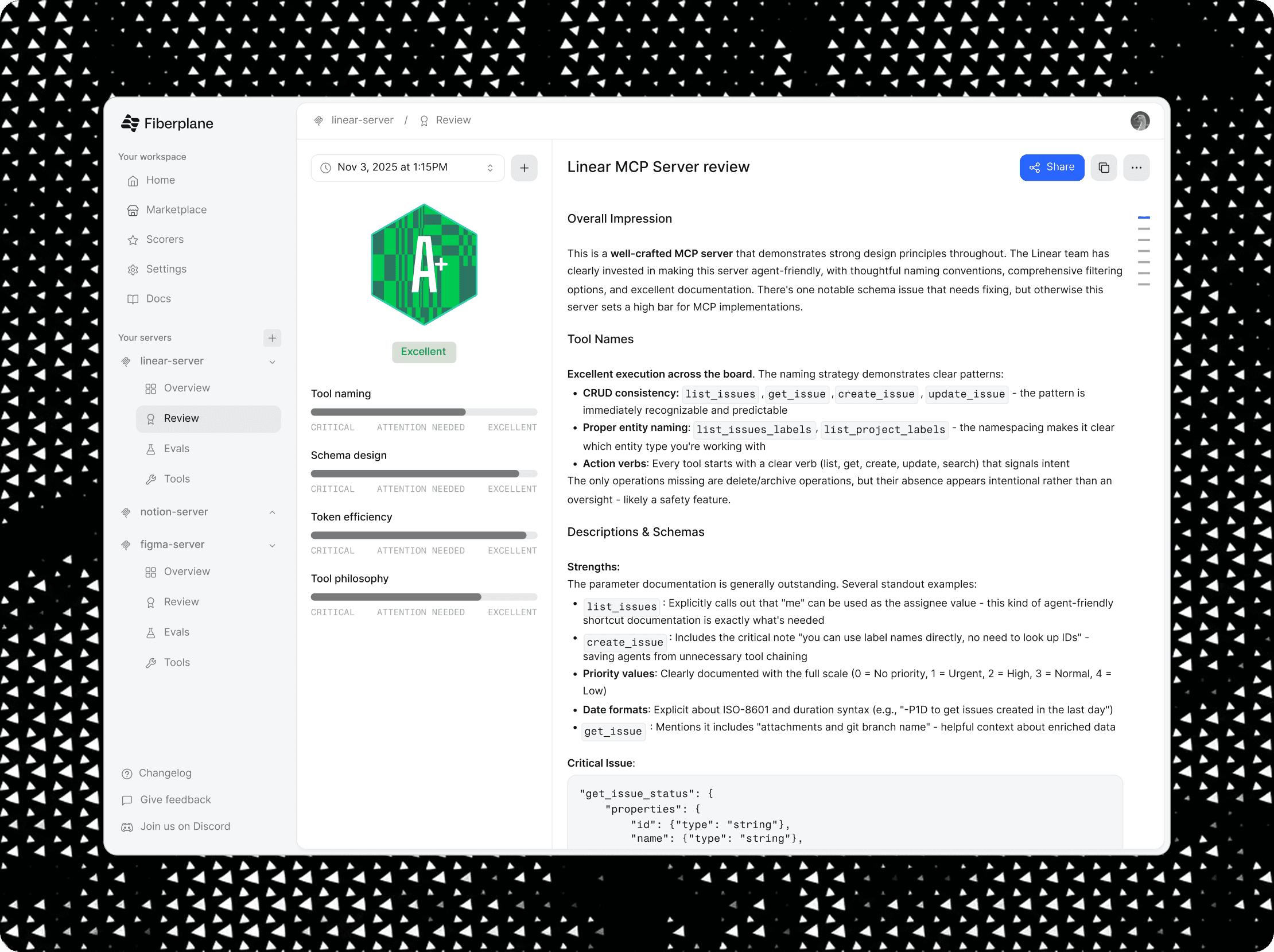 Review your MCP server’s tool names, descriptions, schema choices, and token efficiency, and create scorecards for each version of your MCP server.